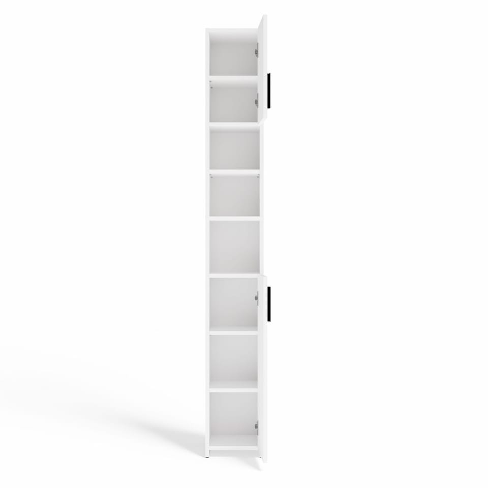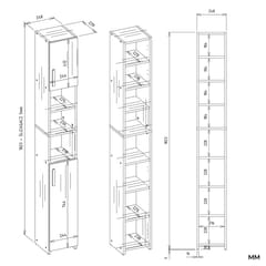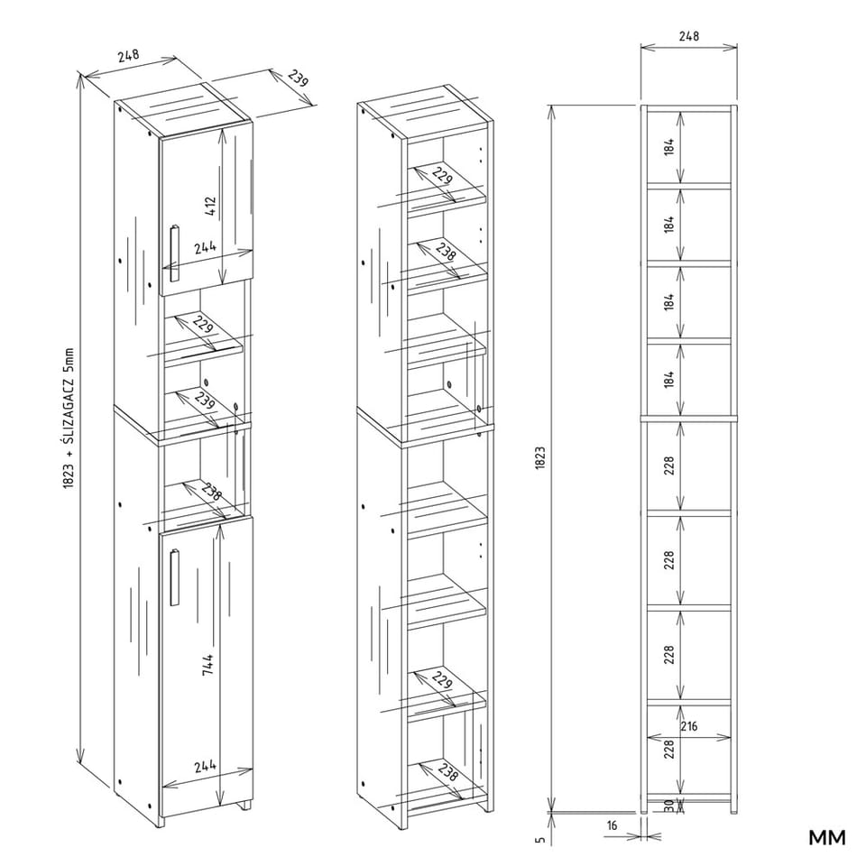 - Zamykana szafka z 2 drzwiami – która zakrywa 3 półki dolne i 2 półki górne, a 3 pozostają wolną przestrzenią która może posłużyć do postawienia drobiazgów