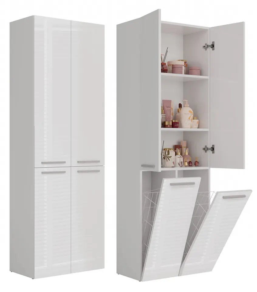 - Szafka posiada 3 praktyczne, zamykane półki oraz 2 kosze