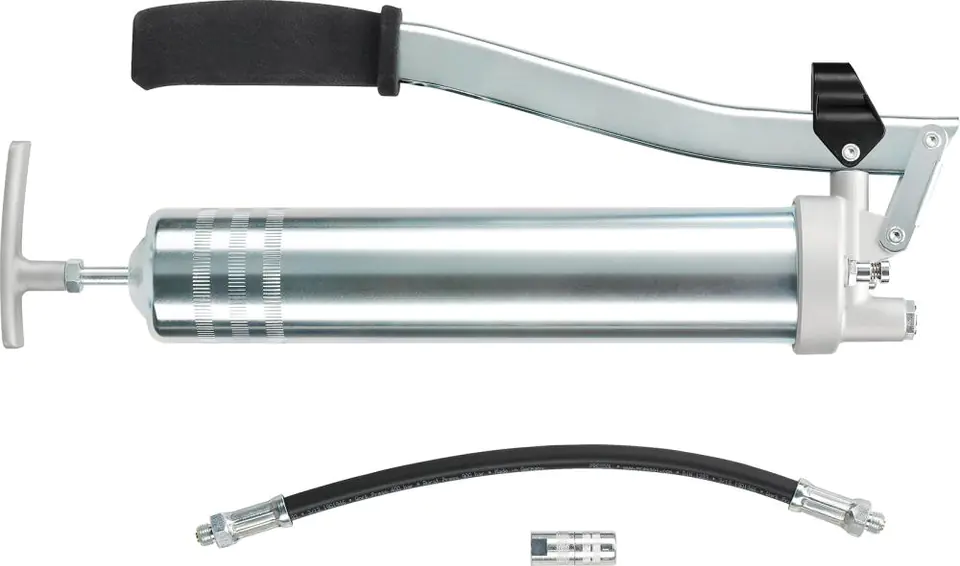 Wykonanie: DIN 1283. Ze stali, ocynkowana, do użytku z dużymi obciążeniami, grubość ścianek 1 mm. Uruchomienie tłoka uchwytem “T”. Kołnierz ze szczelnym osadzeniem w przypadku stosowania smaru stałego luzem lub naboju. Tłok pompy z wysoką dokładnością dopasowania do cylindra (bez smarowania pozornego). Nadaje się do nabojów smarowych 400 g zgodne z normą DIN 1284, urządzenia do napełniania smarem lub smaru luzem. Zestaw zawiera wąż pancerny M10 x 1, 11 x 300 mm i nasadkę, 4 BA, M10 x 1.