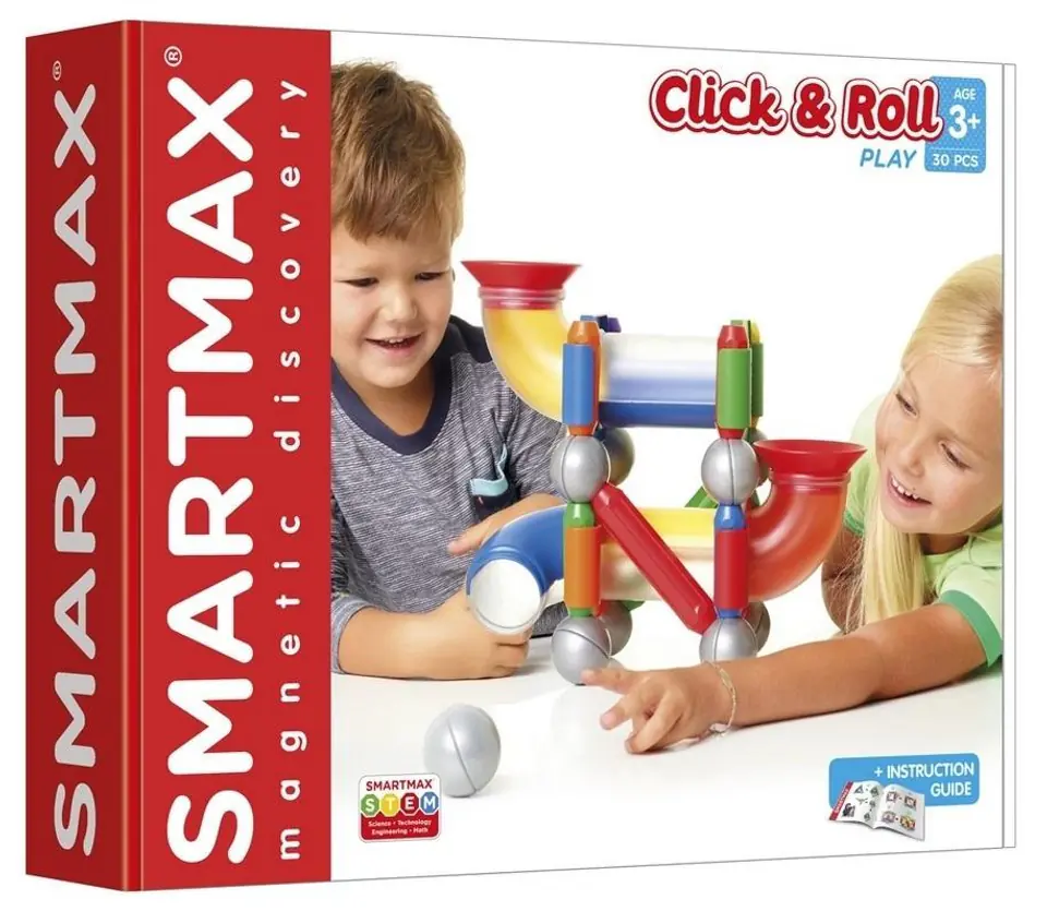 Jest to seria kolorowych klocków magnetycznych dla dzieci. Klocki są w pełni bezpieczne, wszystkie części mierzą więcej niż 3 cm, dzięki temu nie mieszczą się w dziecięcej buzi.Co charakteryzuje SmartMax:- duża wytrzymałość,- wszystkie klocki posiadają dwa bieguny magnetyczne,- jedna kula może połączyć ponad 20 klocków na raz,- siła magnesów dłuższych i krótszych klocków różni się,- różnorodność kształtów i kolorówCo SmartMax może dać twojemu dziecku?- rozwija koordynację wzrokowo-ruchową,- skłania do logicznego myślenia,- kształtuje postrzeganie 2D i 3D,- uczy rozpoznawać kolory,- rozwija umiejętność liczenia,- pobudza kreatywność i wyobraźnię,- świetnie sprawdza się przy grupowych zabawach.Zestaw zawiera:- 9 kul magnetycznych,- 3 łukowate tuby,- 2 długie klocki,- 8 średnich klocków,- 2 proste tuby,- 4 panele z otworami.