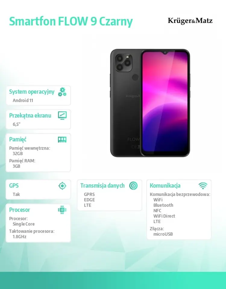I widzisz więcej Poszukujesz smartfona, na którym zmieści się naprawdę dużo treści? 6,5-calowy Kruger&Matz FLOW 9 to model właśnie dla Ciebie. Co ważne, proporcje 19:9 zapewnią wysoki poziom komfortu, zarówno podczas przeglądania stron internetowych, jak też korzystania z różnych aplikacji. Niezawodny w każdym calu Nie wiesz jaki smartfon wybrać? Jeśli zależy Ci na urządzeniu, które Cię nie zawiedzie, koniecznie sprawdź nowy model Kruger&Matz z serii FLOW. Urządzenie to jest napędzane 4?rdzeniowym procesorem MediaTek, wspieranym przez 3 GB RAM i 32 GB pamięci flash. Uchwyć moment Wyjątkowe chwile warto uwieczniać na zdjęciach, a robiąc je telefonem komórkowym możesz je mieć zawsze ze sobą, by podzielić się wspomnieniami z przyjaciółmi. FLOW 9 został oczywiście wyposażony także w przednią kamerę, która umożliwi korzystanie z komunikatorów internetowych. Intuicyjna praca Szeroka funkcjonalność, intuicyjna praca, płynność działania i dostęp do gier i aplikacji ze sklepu Play. Tak pokrótce można opisać system Android. Wybierz smartfon FLOW 9 i poczuj komfort obsługi odświeżonej, jedenastej odsłony tego systemu. Zadbaj o bezpieczeństwo Cenisz swoją prywatność? A może po prostu nie masz pamięci do kodów i wzorów? Smartfon FLOW 9 posiada czytnik linii papilarnych oraz funkcję rozpoznawania twarzy, które umożliwią szybkie i łatwe odblokowanie. Miej pewność, że jesteś jedyną osobą, która ma dostęp do Twojego telefonu. Praktyczne udogodnienia Często płacisz bezgotówkowo? Teraz możesz zapomnieć nawet o karcie płatniczej ? zastąpi Ci ją smartfon Kruger&Matz FLOW 9. Urządzenie posiada moduł NFC, który umożliwi zbliżeniowe płacenie. Przekonaj się, jakie to wygodne. Wybierz swój styl Niezależnie czy jesteś fanem klasyki czy bardziej oryginalnych rozwiązań ? FLOW 9 trafi w Twoje gusta. Urządzenie jest dostępne w dwóch wersjach kolorystycznych. Zdecyduj czy do Twojego stylu bardziej pasuje stonowana czerń czy metaliczny błękit. Możesz więcej Najlepsze smartfony powinny zapewnić jak najszerszą funkcjonalność, dlatego Kruger&Matz FLOW 9 posiada aż 3 sloty na karty ? 2 nano SIM oraz 1 micro SD. Teraz możesz w tym samym momencie korzystać z dwóch numerów oraz rozszerzyć pamięć telefonu o kartę pamięci. Złoty środek Pojemność baterii w smartfonie Kruger&Matz FLOW 9 jest doskonałym przykładem złotego środka. 5000 mAh pozwoli na swobodne korzystanie z różnych aplikacji przez wiele godzin, przy zachowaniu jednocześnie smukłej budowy urządzenia.