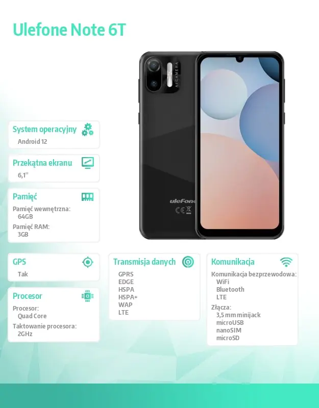 Smartphone ULEFONE Note 6T 3/64 GB Black Czarny) 64 GB Czarny UF-N6T/B