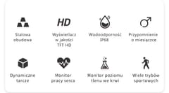 Funkcje: Energooszczędny Bluetooth Chip wersja 5.0, monitor tętna, ciśnieniomierz, monitor tlenu we krwi, przypomnienie o miesiączce krokomierz, inteligentny monitoring snu, monitor cyklu dobowego, budzik stoper, timer rejestr spalonych kalorii, rejestr przebytego dystansu, 6 trybów treningu do wyboru, sterowanie muzyką, zdalne zdjęcie, tryb nie przeszkadzać, powiadomienia o wiadomościach z telefonu, przypomnienia i inne. Multi-dynamiczne motywy tarczy do wyboru.