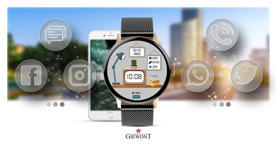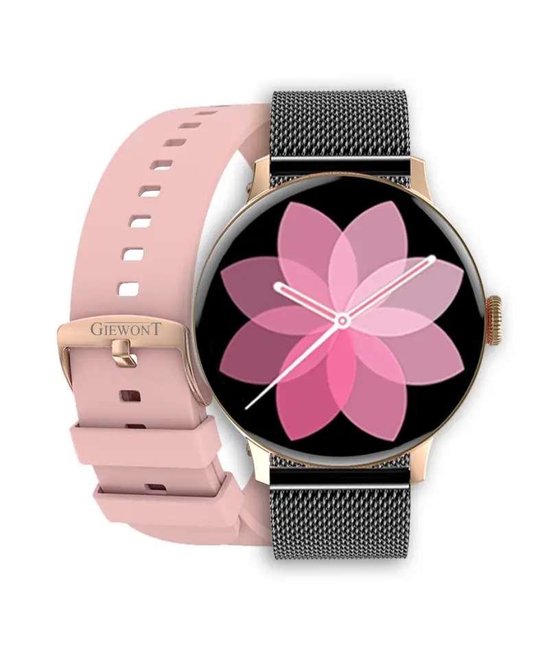 Smartwatch Damski GIEWONT GW330-4 to nowoczesny i stylowy dodatek, który doskonale łączy funkcjonalność z eleganckim, kobiecym designem. Został zaprojektowany tak, aby podkreślać indywidualny styl użytkowniczki, jednocześnie oferując praktyczne rozwiązania na każdy dzień. Smukła koperta i subtelne detale sprawiają, że zegarek prezentuje się wyjątkowo szykownie, a możliwość wymiany paska pozwala jeszcze lepiej dopasować go do stroju i okazji. Urządzenie oferuje szeroki zakres funkcji, które usprawniają codzienność. Można z niego rozmawiać, odczytu wiadomości i powiadomień z telefonu, przez kontrolę muzyki, aż po wygodne zdalne sterowanie aparatem. Wszystko to dostępne jest na wyraźnym, kolorowym ekranie, który zapewnia komfort obsługi niezależnie od warunków. GIEWONT GW330-4 wspiera również dbanie o zdrowie i dobre samopoczucie. Monitoruje tętno w czasie rzeczywistym, analizuje jakość snu oraz zlicza kroki i spalone kalorie, dzięki czemu możesz na bieżąco śledzić swoje postępy. Wbudowane tryby sportowe motywują do aktywności i pomagają świadomie planować treningi. Smartwatch jest idealnym narzędziem zarówno dla osób prowadzących intensywny, aktywny tryb życia, jak i tych, które chcą zadbać o regularny ruch na co dzień. Wydajna bateria zapewnia wielodniowe działanie bez konieczności częstego ładowania, co czyni GW330-4 niezwykle praktycznym urządzeniem do pracy, domu i podróży. To smartwatch, który jest nie tylko piękny, ale także inteligentny – niezawodnie wspiera Cię w organizacji dnia, dba o Twoje zdrowie i dodaje stylu każdej stylizacji. Jeśli szukasz zegarka, który potrafi więcej i wyróżnia się elegancją, GIEWONT GW330-4 będzie strzałem w dziesiątkę.