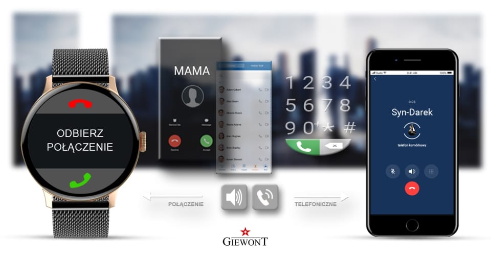 - Rozmowy - wykonywanie i odbieranie połączeń z poziomu smartwatcha