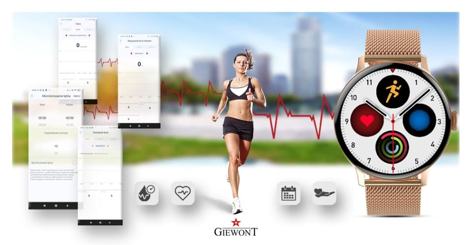 Dzięki sensorowi możesz w każdej chwili zmierzyć lub wykonać pomiar: ciśnienia krwi, tętna lub saturacji - zawartość tlenu we krwi w swoim organizmie. Kontroluj wyniki podczas każdej aktywności fizycznej. Niezależnie czy jeździsz na rowerze, biegasz, czy też po prostu jesteś w pracy lub odpoczywasz. Twój smartwatch Giewont stanie się osobistym asystentem dbającym o twoje zdrowie każdego dnia.