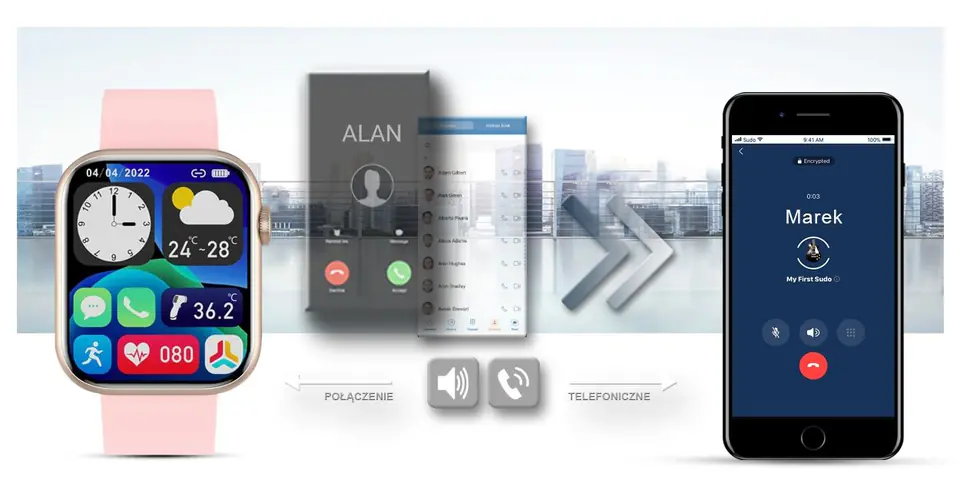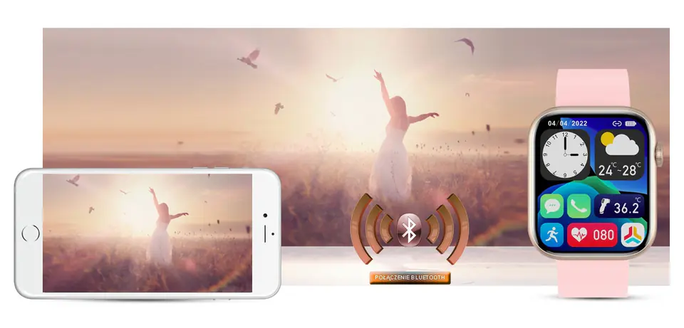 Ten smartwatch możesz połączyć ze swoim Smartfonem. Kompatybilność z systemem Android 4.4 i nowszy oraz iOS 8.0 i nowszy. Oznacza to, że smartwatch połączy się ze wszystkimi telefonami na systemie ANDROID i iOS.