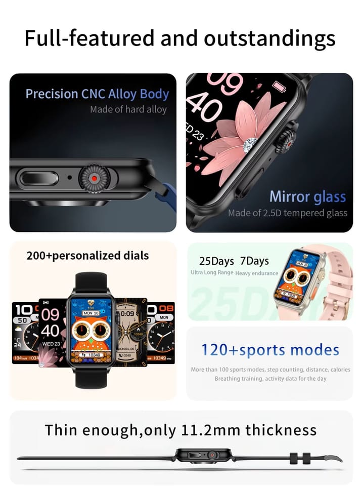 Zegarek działa w duecie z aplikacją DaFit, w pełni po polsku, i obsługuje systemy Android i iOS. Wewnątrz – bateria 200 mAh, która spokojnie dotrzyma Ci kroku przez cały dzień.Ale to, co najważniejsze, to jego funkcjonalność: – ponad 120 trybów sportowych + trening oddechu. Smartwatch zadba o Twoje zdrowie i samopoczucie – mierzy tętno, ciśnienie, poziom tlenu, liczy kroki i spalone kalorie, analizuje sen oraz monitoruje cykl menstruacyjny, przypominając o ruchu i nawodnieniu. Do tego daje szybki dostęp do powiadomień z aplikacji, sterowanie muzyką, zdalne zdjęcia, prognozę pogody, budzik, timer, latarkę i funkcję „znajdź urządzenie” – wszystko, czego potrzebujesz, masz zawsze pod ręką.