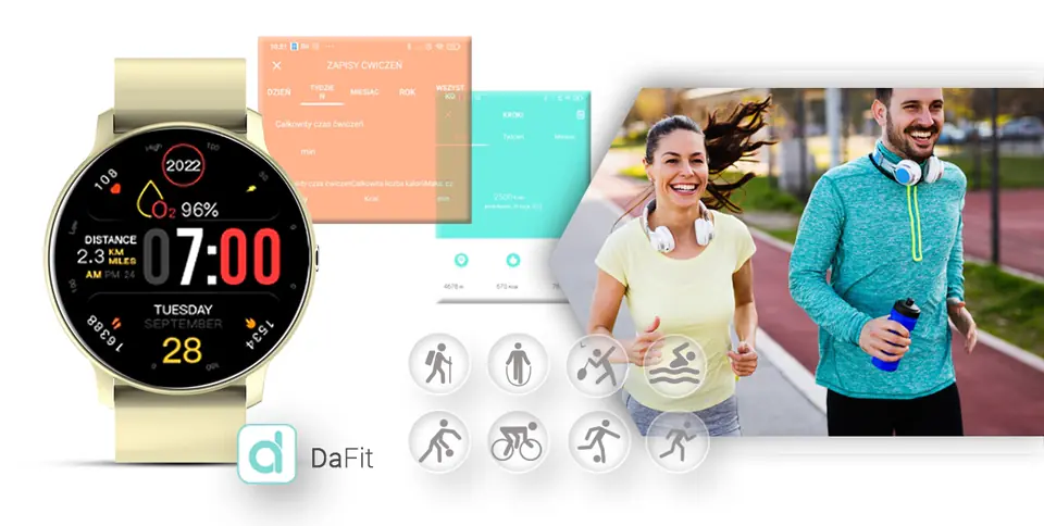 Smartwatch idealny dla aktywnych osób, którzy czas wolny spędzają na uprawianiu sportu i dbanie o zdrowy tryb życia. Ten model posiada wiele różnych trybów sportowych: koszykówka, rower, bieganie, chodzenie, skakanie, piłka nożna i badminton, które pozwolą w łatwy sposób kontrolować trening lub zabawę sportową. Pozwoli ci zaplanować i kontrolować czas, dystans, spalanie kalorii i efekt treningu.