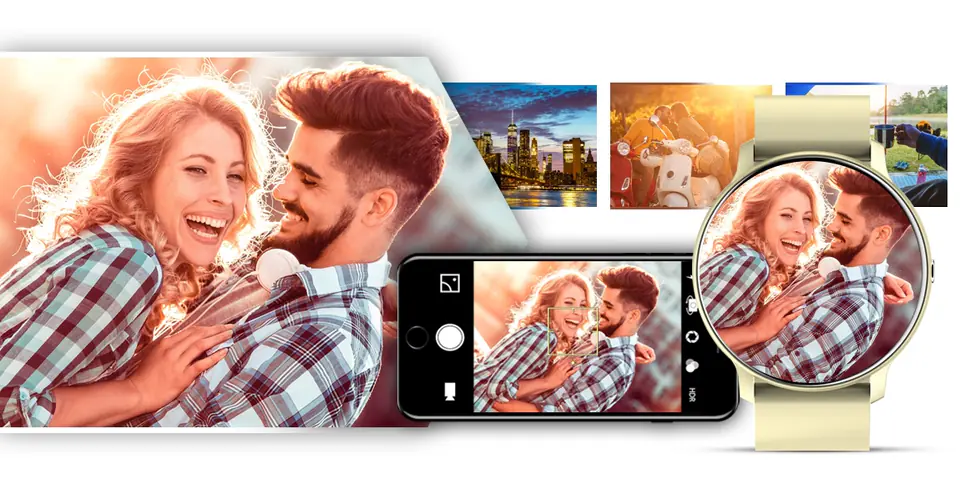 Od teraz możesz bezprzewodowo robić zdjęcia z telefonu za pomocą połączenia z smartwatchem. Po prostu uruchamiasz migawkę w obiektywie smartfona i robisz takie zdjęcia, które do tej pory były poza Twoim zasięgiem. Ustaw odpowiednio telefon i uchwyć najlepsze momenty z Twojego życia za pomocą smartwatcha. Ustaw, przechwyć i podziel się zdjęciem z znajomymi. Dzięki możliwości wykonywania zdjęć z pozycji smartwatcha, możesz bezproblemowo stworzyć swój indywidualny ekran główny, który jeszcze bardziej będzie symbolizował twój styl.