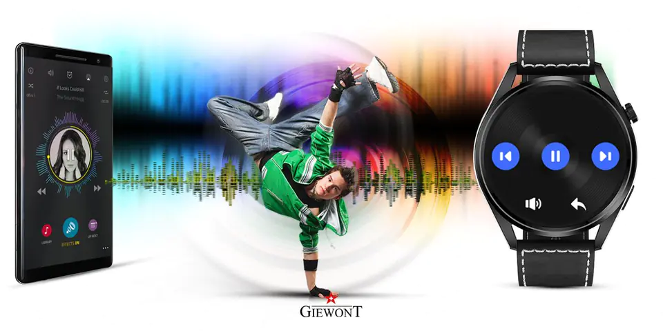 Sterowanie muzyką Każdy lubi słuchać swoją ulubioną muzykę. Dzięki bezprzewodowemu połączeniu poprzez bluetooth, od teraz możesz sterować odtwarzaczem muzycznym twojego telefonu komórkowego z poziomu smartwatcha. W ten sposób możesz uprawiać sport w rytm ulubionej muzyki lub relaksować się bez konieczności wyciągania smartfona.