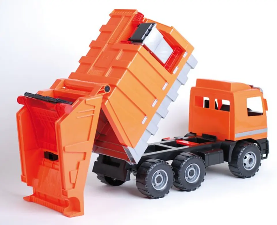 Super śmieciarka Mercedes Garbage Truck, model ACTROS, trójosiowa, w kolorze pomarańczowym ze srebrnymi dodatkami. Wykonana z wysokiej klasy plastiku, spełnia normy Europejskie. Śmieciarka jest wyposażona w dwa mechanizmy przechyłowe do wysypu śmieci oraz dwóch dołączonych kubłów, znajdujących się z tyłu i z prawego boku pojazdu. Pojazd ten jest bardzo funkcjonalny i ciekawy do zabawy. Maksymalne obciążenie śmieciarki to 100 kg, więc dziecko może na nią siadać. Długość pojazdu wynosi 74 cm.