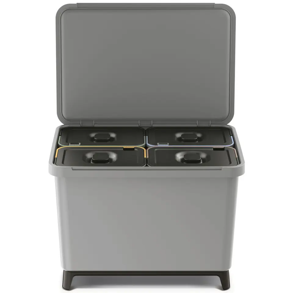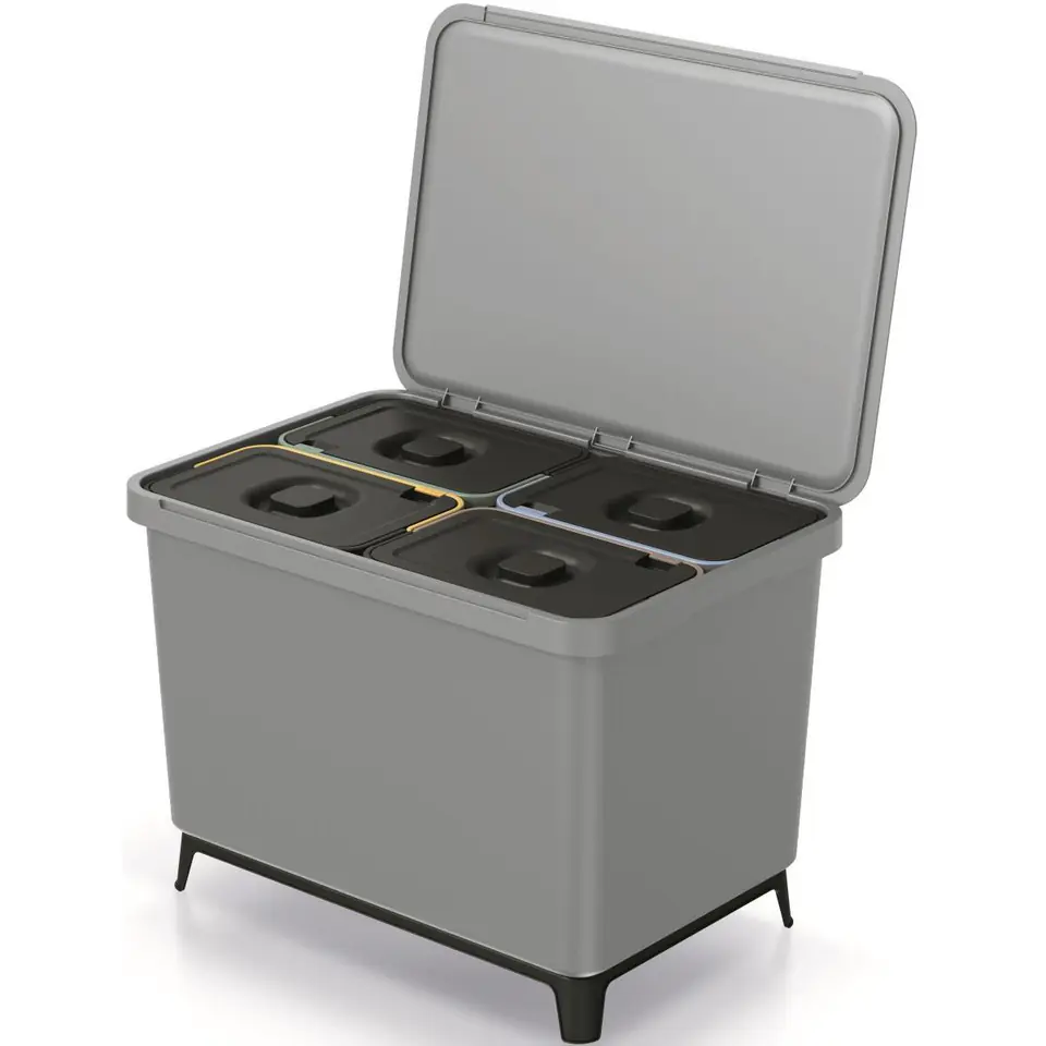 Ten funkcjonalny śmietnik z 4 wkładami w środku, każdy o pojemności 10 L, zapewnia szybki dostęp, niekłopotliwe opróżnianie oraz łatwe czyszczenie i segregację.