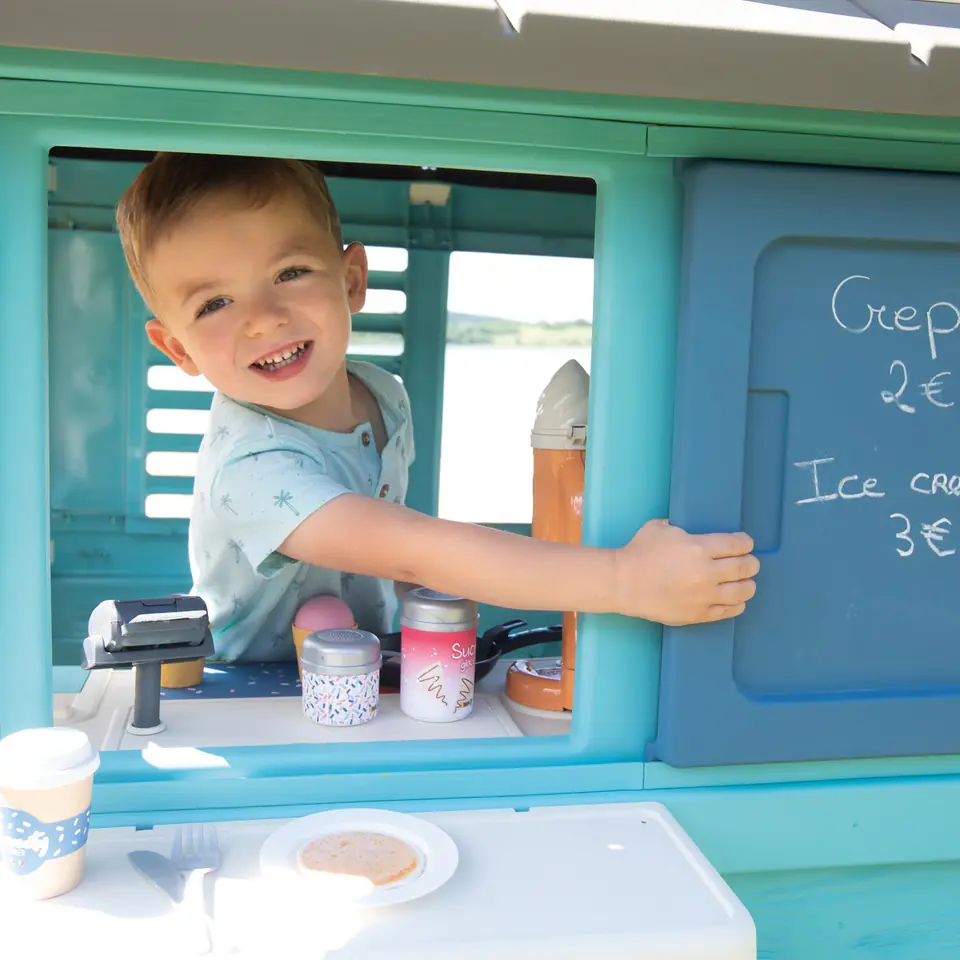 - - domek posiada 2 okna z żaluzjami , w tym jedno z odsuwaną okiennicą (można na niej zapisać menu lub cennik),
