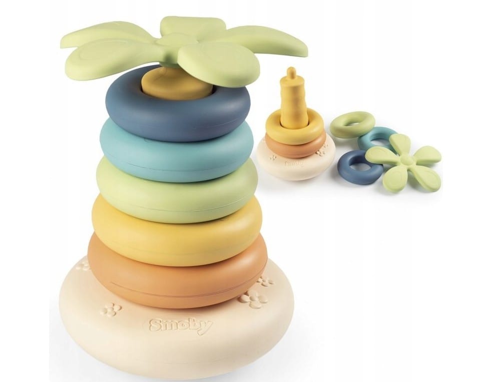 - - pastelowy zestaw składa się z 6 elementów - 5 krążków i 1 klocka w kształcie liści palmy,
