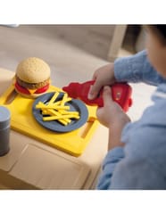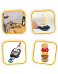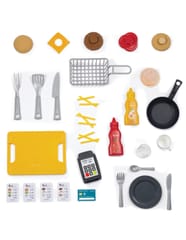 - - zestaw zawiera 29 akcesoriów - patelnię, deskę do krojenia, talerz, sztućce, szklankę, kubek, koszyk, przybory kuchenne, hamburgera, frytki, naleśnika (po przewróceniu na patelni zmienia kolor), sosy, paragony, kartę kredytową.