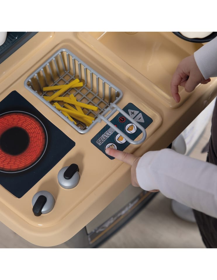 - - posiada imitację płyty grzewczej (1 palnik), frytkownicę, zlewozmywak z kranem, piekarnik i lodówkę z otwieranymi drzwiczkami,