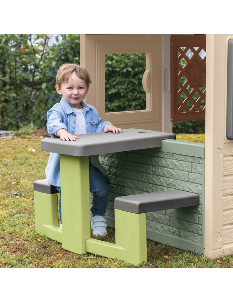 Smoby Stolik Piknikowy to doskonały sposób na wzbogacenie domku ogrodowego i stworzenie dodatkowej przestrzeni do zabawy. Dzięki niemu dzieci będą mogły zorganizować piknik, zjeść przekąskę z przyjaciółmi, a także naśladować dorosłych podczas przygotowywania posiłków, co rozwija ich wyobraźnię i umiejętności społeczne. Produkt jest wykonany z wytrzymałego tworzywa sztucznego, co zapewnia łatwość w utrzymaniu czystości. Dzięki powłoce ANTI-UV, stolik i ławki zachowują swoje intensywne kolory przez długi czas, nawet pod wpływem promieni słonecznych. Stonowane, naturalne barwy doskonale pasują do domków ogrodowych Smoby.
