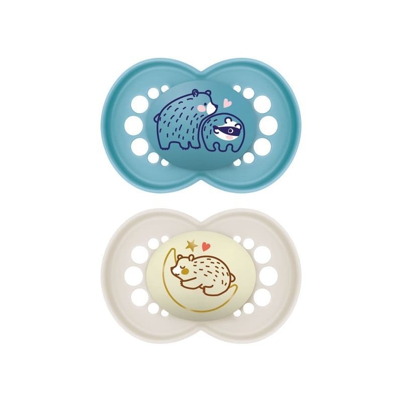 Original Day and Night - Smoczek Cechy: -Smoczek świecący w ciemności - łatwo odnaleźć jego świecący guzik -Przyjazny dla skóry dzięki dużym otworom przepuszczającym powietrze i wyjątkowej warstwie wewnętrznej opracowanej przez MAM -Ortodontyczny -Wykonany z silikonu MAM SkinSoft™ lub naturalnego kauczuku -Uspokaja i zapewnia dziecku poczucie komfortu -Sprzedawany w praktycznym pudełku do sterylizacji i przechowywania, umożliwiającym wygodną i szybką sterylizację w kuchence mikrofalowej Wiek: 16m+