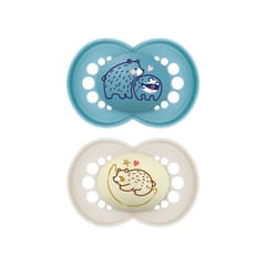 Original Day and Night - Smoczek Cechy: -Smoczek świecący w ciemności - łatwo odnaleźć jego świecący guzik -Przyjazny dla skóry dzięki dużym otworom przepuszczającym powietrze i wyjątkowej warstwie wewnętrznej opracowanej przez MAM -Ortodontyczny -Wykonany z silikonu MAM SkinSoft™ lub naturalnego kauczuku -Uspokaja i zapewnia dziecku poczucie komfortu -Sprzedawany w praktycznym pudełku do sterylizacji i przechowywania, umożliwiającym wygodną i szybką sterylizację w kuchence mikrofalowej Wiek: 6m+