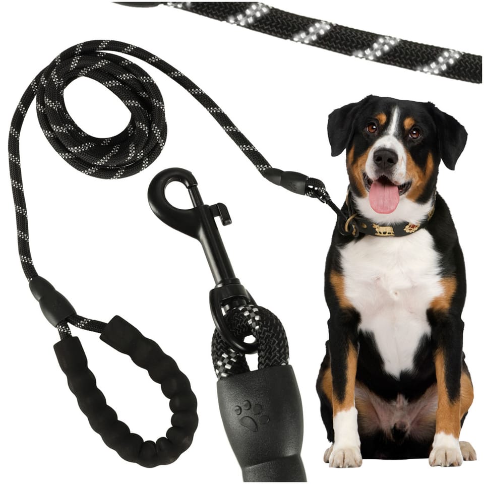 Wytrzymały sznur i chromowany karabińczyk utrzyma średnie i nieco większe rasy.
