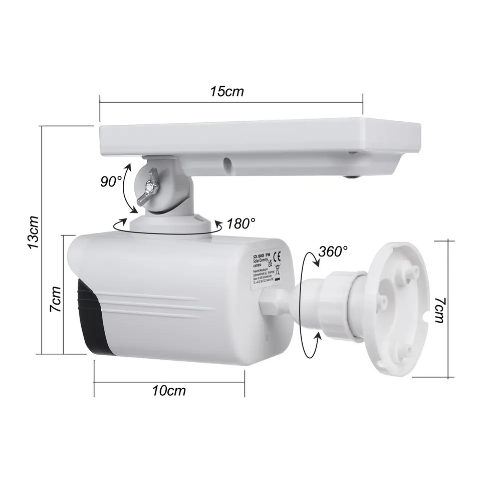 Atrapy kamery z migającą diodą oraz wbudowanym panelem solarnym!Bardzo wierne kopie oryginalnych kamer z imitacją diod IR i diodą świecącą na czerwono. Ich wykonanie cechuje się wysoką jakością użytych materiałów i dbałością o szczegóły. Migający element w postaci diody LED zwraca uwagę rzucając się w "oko". Główna istota takiego rozwiązania jest w pełni skuteczna w nocy bądź ciemnych pomieszczeniach.Łatwość montażu sprawia, iż szybko i bez żadnych problemów zainstalujesz atrapy na ścianie. W zestawie komplet śrub i kołków rozporowych wymaganych do montażu atrap. Nie jest konieczne prowadzenie żadnych przewodów i kabli. Można je stosować wewnątrz i na zewnątrz budynków. Idealne rozwiązanie na działkach, posesjach prywatnych czy w sklepach. Skutecznie odstraszą potencjalnych złodziei i wandali.