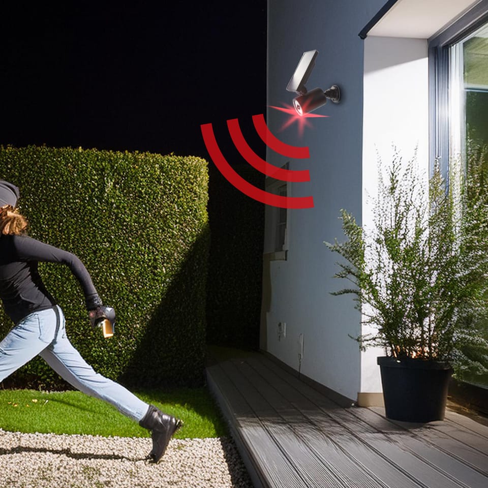 Specyfikacja- Model: SOL1801S- Wymiary: 11,7 x 9,1 x 17,0 cm- Klasa ochrony: IP44- Czas świecenia po wykryciu ruchu: 30 sekund- Migająca czerwona dioda LED- Źródło zasilania: panel solarny- Typ żarówki: 8+1 LED- Typ czujnika ruchu: PIR- Odległość detekcji: 6-10 metrów- Temperatura barwowa światła: 6500K- Strumień świetlny: 220 lumenów- Akumulator: litowy 18650, 3.7V 1500 mAh- Czas ładowania: 6 godzin (w bezpośrednim świetle słonecznym)