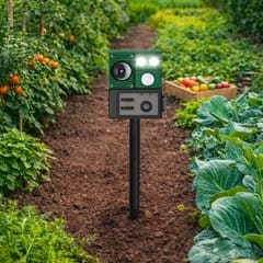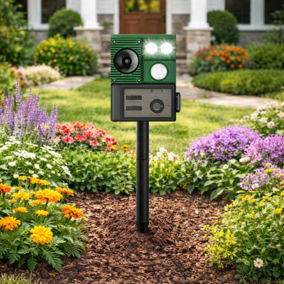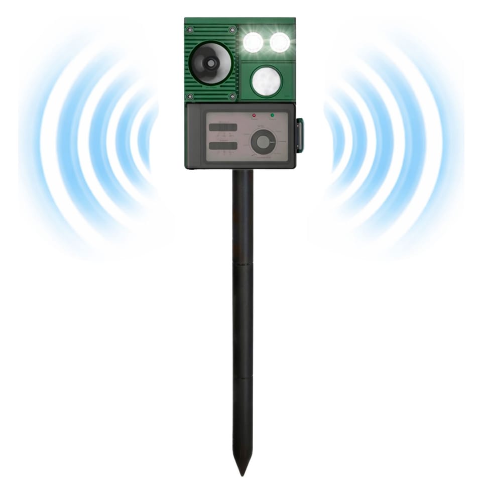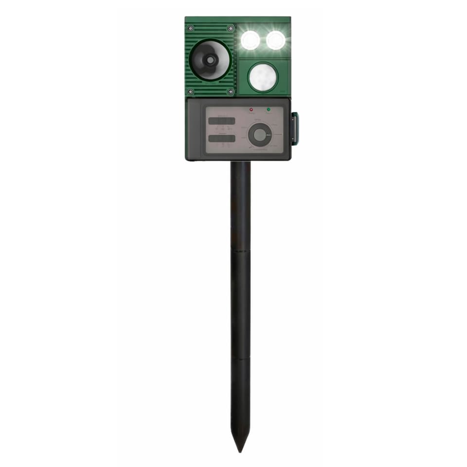 Odstraszacz emituje fale ultradźwiękowe oraz sygnały dźwiękowe, które skutecznie odstraszają zwierzęta, nie powodując im szkody. Wbudowana latarka LED dodatkowo wzmacnia efekt odstraszający, szczególnie po zmroku. Solidna konstrukcja oraz szpikulec montażowy umożliwiają szybkie i stabilne umieszczenie urządzenia w ziemi.