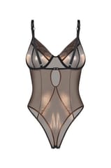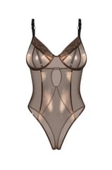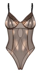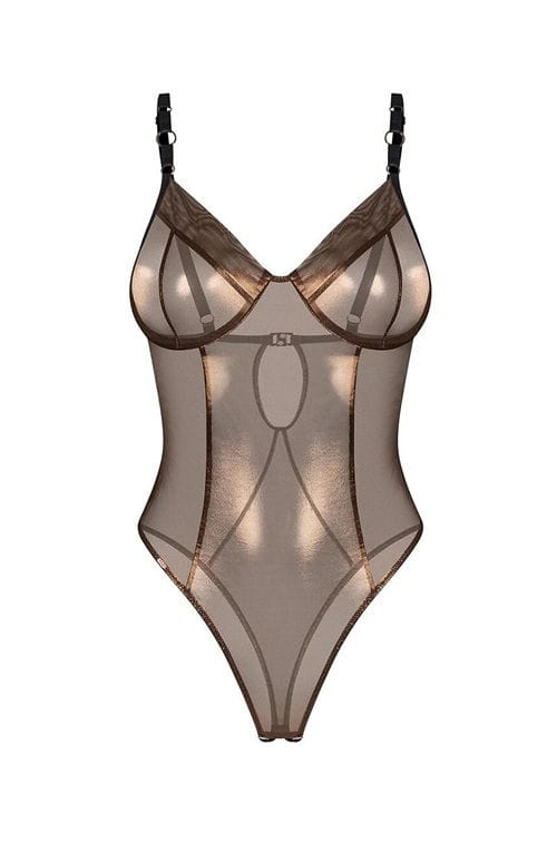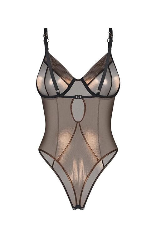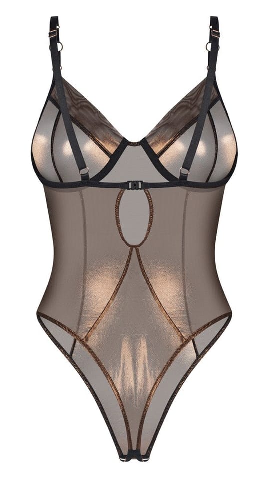 Otwarte body z połyskującej siateczki – kobiecość i prowokacja w jednym!Zmysłowe body wykonane z delikatnej, złotej siateczki o transparentnym charakterze subtelnie odkrywa ciało, pozostawiając miejsce na wyobraźnię.Fiszbiny pod biustem pięknie eksponują piersi, a dopasowany krój podkreśla naturalne kształty sylwetki.Otwarty dół dodaje całości prowokującego, drapieżnego akcentu, idealnego na pełne namiętności chwile.Najważniejsze cechy:eleganckie body z pikantnym akcentem (otwarty krok)fiszbiny pod biustemregulowane ramiączkatransparentna siateczka ze złotym połyskiemdopasowany, kobiecy krójmateriał: 95% poliester, 5% elastandesigned in EUProdukt nieodpowiedni dla dzieci poniżej 3 lat – ryzyko zadławienia z powodu małych części mogących się odłączyć od produktu.