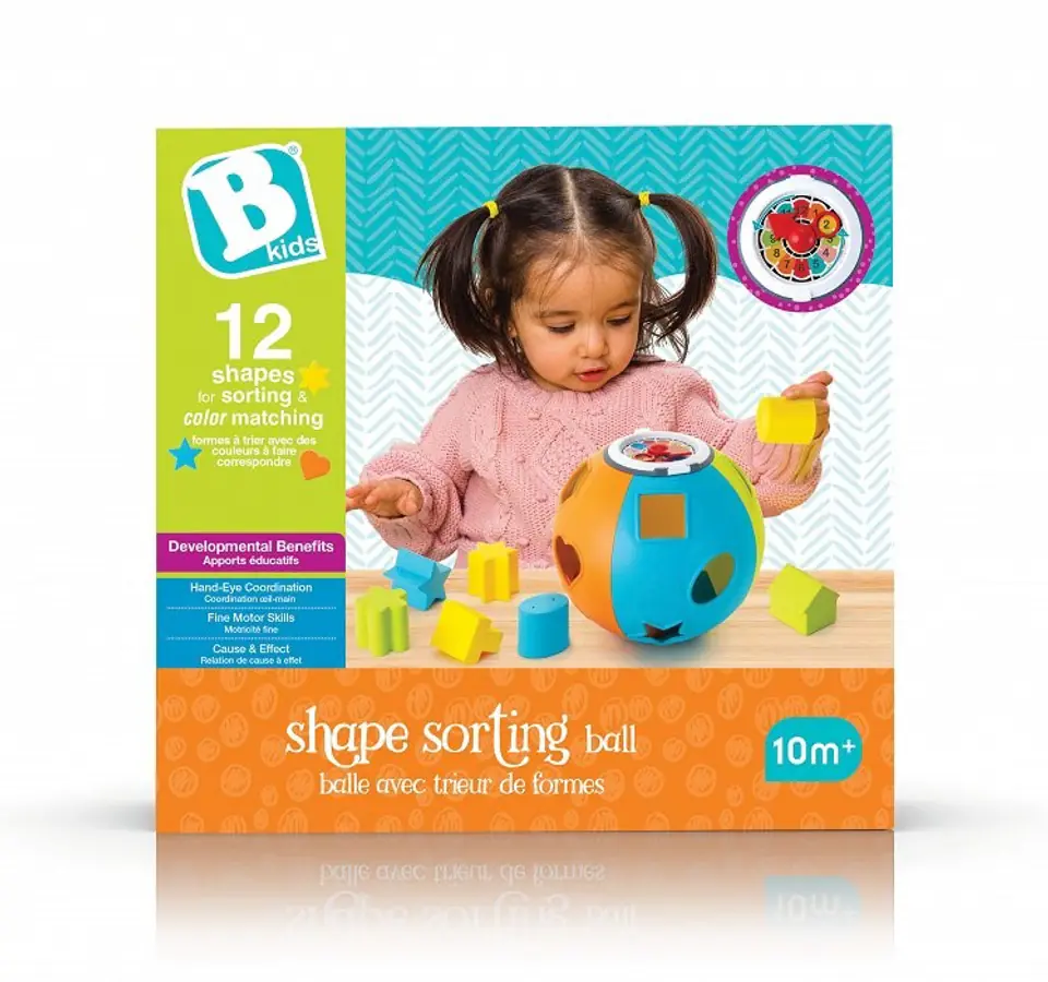 Klasyczny sorter w kształcie piłki. 12 klocków w różnych kształtach i kolorach można wrzucać do środka piłki przez odpowiednie otwory. Na górze sortera znajduje się koło ze wskazówką i cyframi 1-12 co pomoże dziecku nauczyć się godzin.