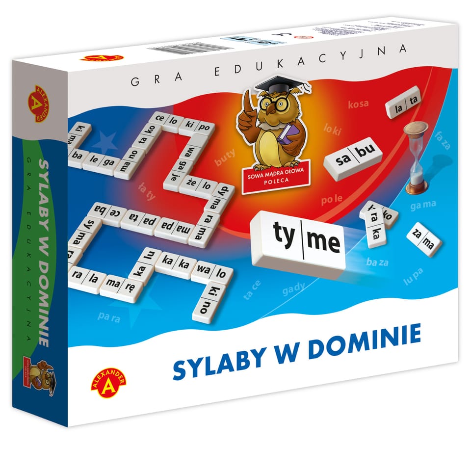 Gra dydaktyczna, polegająca na dopasowaniu odpowiednich sylab w taki sposób, by powstały poprawne formy wyrazów dwusylabowych. Uczestnicy gry ćwiczą swą spostrzegawczość, refleks, kojarzenie właściwych słów, a także utrwalają pisownię budowanych wyrazów. Gra zapewni pożyteczną i emocjonującą rozrywkę dla całej rodziny, ale może być również wykorzystywana jako pomoc dla terapeutów, logopedów i nauczycieli.56 kostek domina, klepsydra, worek foliowy, 2 tablice wyrazów, 16 żetonów , instrukcja.