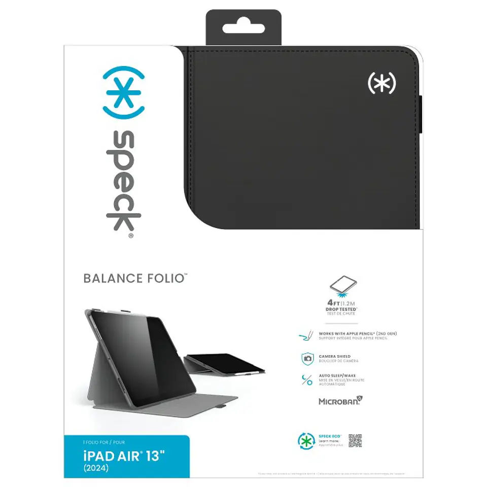 Pomimo niezwykle smukłego profilu, etui gwarantuje zaawansowaną ochronę urządzenia. Trwała dwuwarstwowa ochrona - twarda warstwa zewnętrzna i miękka warstwa IMPACTIUM™ zabezpiecza urządzenie przed uderzeniami i zarysowaniem. Lekko podwyższone krawędzie wokół obudowy iPada stanowią dodatkową osłonę, zapobiegając jego uszkodzeniu.Magnesy wbudowane w przednią klapkę automatycznie wybudzają oraz usypiają iPada, gdy tylko zostanie ona otwarta lub zamknięta.Bezpieczne zamknięcie Balance Folio zapobiega przypadkowemu otwarciu obudowy.Wbudowany wygodny uchwyt na Apple Pencil pozwala mieć go zawsze przy sobie i zapobiega jego zgubieniu.Etui zostało wykonane z wytrzymałych i łatwych do czyszczenia materiałów, wysoce odpornych na trudy użytkowania, co gwarantuje wyjątkowy wygląd na długi czas. Niezależna, rozsuwana osłona kamery, stanowi dodatkową ochronę urządzenia oraz ułatwia wykonywanie zdjęć.Składana tylna klapka, oferuje wiele kątów korzystania z iPada, tym samym możesz na nim wygodnie pisać, oglądać filmy czy surfować po internecie.Podobnie jak wszystkie produkty Speck, etui zostało poddane testom laboratoryjnym, w których sprawdzono je w ekstremalnych temperaturach, odporności na uderzenia i upadki oraz na działanie chemikaliów.Dodatkowy komfort użytkowania zapewnia niewidzialna powłoka antybakteryjna firmy MICROBAN®, która redukuje ilość zarazków zbierających się na powierzchni etui o 99%.Cechy produktu:· Wbudowany wygodny uchwyt na Apple Pencil· Powłoka antybakteryjna firmy Microban® (redukuje ilość zarazków o 99%)· Ochrona urządzenia przed wstrząsami i skutkami upadków· Dwie warstwy ochronne: zewnętrzna twarda warstwa z poliwęglanu połączona z wewnętrzną warstwą IMPACTIUM™ Shock Barrier absorbująca wstrząsy· Funkcja wybudzania/usypiania, dzięki wbudowanym magnesom· Składana klapka, pozwalająca na ustawienie tabletu pod różnymi kątami· Odsuwana osłona kamery ułatwia robienie zdjęć· Lekko podniesione oraz wzmocnione brzegi wokół urządzenia zapewniająca dodatkową ochronę· Klamra zabezpieczająca przed przypadkowym otwarciem etui· Miękka wewnętrza wkładka zabezpieczająca ekran przed przypadkowym porysowaniem· Wytrzymałe w użytkowaniu oraz łatwe w czyszczeniu materiały· Materiały: Skóra ekologiczna, PC, Mikrofibra· Wymiary: 29,01x24x1,80 cm· Waga: 560g· Kompatybilność: Apple iPad Air 13” M4 (2026) / M3 (2025) / M2 (2024)