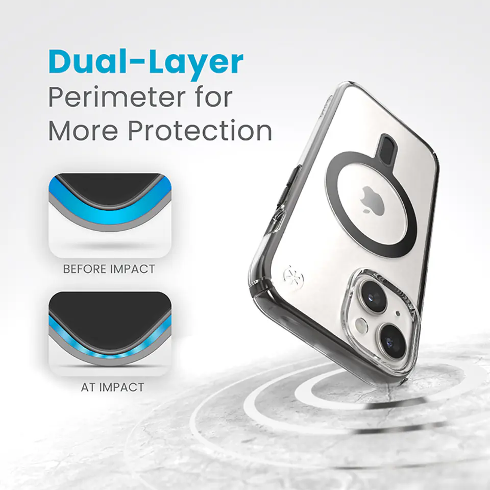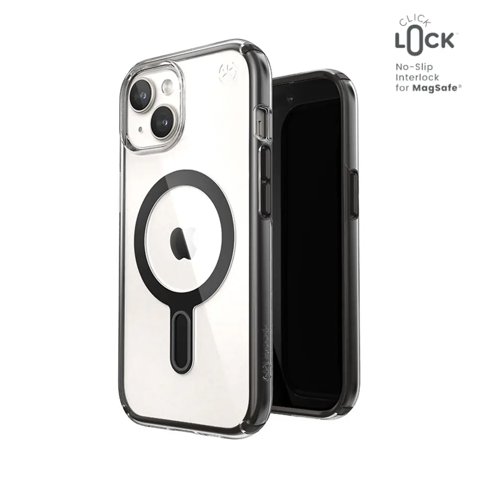 Speck Presidio® Perfect-Clear MagSafe® z technologią antypoślizgową ClickLock™ Interlock to przezroczyste etui z wbudowanym magnesem, kompatybilnym z akcesoriami Apple MagSafe®.Konstrukcja etui wykonana została w technologii IMPACTIUM™ Shock Barrier, która chroni telefon przed uszkodzeniami podczas upadku z wysokości prawie 4 m. To wszystko dzięki dwóm warstwom: zewnętrznej, która rozprasza siłę uderzenia oraz wewnętrznej IMPACTIUM™, absorbującej wstrząs.Podwyższona ramka wokół ekranu i aparatu zapewnia dodatkową ochronę przed zarysowaniami i uszkodzeniami.Innowacyjna technologia ClickLock™ Interlock tworzy antypoślizgową blokadę magnetyczną między etui Speck MagSafe® a wybranymi akcesoriami Speck, eliminując przypadkowy upadek urządzenia.Etui wykonane zostało w 50% z tworzyw sztucznych pochodzących z recyklingu, które nie ulega odbarwieniom pod wpływem światła UV. Specjalna powłoka sprawia, że obudowa Speck nie robi się żółta i przez cały czas wygląda jak nowa. Więcej informacji na stornie www.speckeco.comOryginalna obudowa ochronna Perfect-Clear oferuje również ochronę antybakteryjną MICROBAN® (światowy lider rozwiązań przeciwdrobnoustrojowych z szerokim portfolio ponad 25 zatwierdzonych technologii). Aktywny składnik wbudowany w strukturę etui powstrzymuje 99% bakterii, które gromadzą się na powierzchni etui. Technologia MICROBAN® zapewnia w ten sposób dożywotnią ochronę przed bakteriami powodującymi plamy i nieprzyjemne zapachy oraz działa na poziomie komórkowym, aby utrzymać czystość obudowy.Akcesoria Speck ClickLock™ współpracują również ze wszystkimi akcesoriami z funkcją MagSafe, także bez wbudowanego systemu ClickLock™.Cechy produktu:· Innowacyjna technologia ClickLock™ Interlock· Wbudowany pierścień magnetyczny kompatybilny z wszystkimi akcesoriami Apple MagSafe®· Czarne wykończenie pierścienia magnetycznego· Tylny, przezroczysty panel - materiał odporny na odbarwienia UV i żółknięcie· Wytrzymuje upadki z wysokości nawet 4 metrów (Clear impact technology)· Aktywna ochrona antybakteryjna MICROBAN®· Podwyższona ramka ekranu i aparatu· Wykonane w 50% z tworzyw sztucznych pochodzących z recyklingu (www.speckeco.com)· Kompatybilna z bezprzewodowymi ładowarkami Qi· Nie blokuje płatności zbliżeniowych Apple Pay· Kompatybilne z ładowarką Apple MagSafe