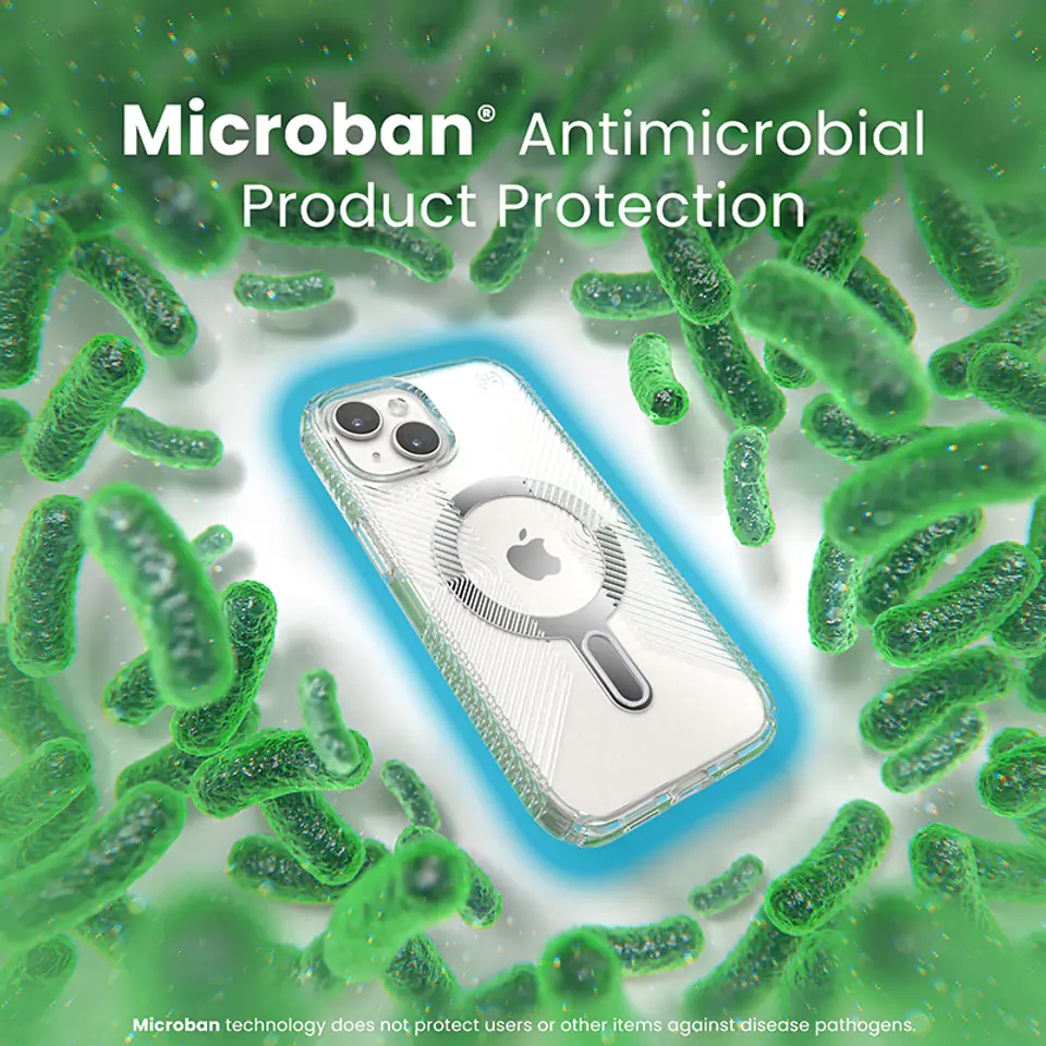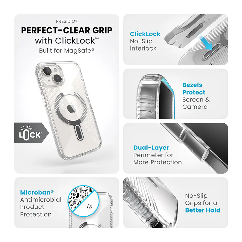 Speck Presidio® Perfect-Clear MagSafe® z technologią antypoślizgową ClickLock™ Interlock to przezroczyste etui z wbudowanym magnesem, kompatybilnym z akcesoriami Apple MagSafe®.Konstrukcja etui wykonana została w technologii IMPACTIUM™ Shock Barrier, która chroni telefon przed uszkodzeniami podczas upadku z wysokości prawie 4 m. To wszystko dzięki dwóm warstwom: zewnętrznej, która rozprasza siłę uderzenia oraz wewnętrznej IMPACTIUM™, absorbującej wstrząs.Podwyższona ramka wokół ekranu i aparatu zapewnia dodatkową ochronę przed zarysowaniami i uszkodzeniami.Innowacyjna technologia ClickLock™ Interlock tworzy antypoślizgową blokadę magnetyczną między etui Speck MagSafe® a wybranymi akcesoriami Speck, eliminując przypadkowy upadek urządzenia.Etui wykonane zostało w 50% z tworzyw sztucznych pochodzących z recyklingu, które nie ulega odbarwieniom pod wpływem światła UV. Specjalna powłoka sprawia, że obudowa Speck nie robi się żółta i przez cały czas wygląda jak nowa. Więcej informacji na stornie www.speckeco.comOryginalna obudowa ochronna Perfect-Clear oferuje również ochronę antybakteryjną MICROBAN® (światowy lider rozwiązań przeciwdrobnoustrojowych z szerokim portfolio ponad 25 zatwierdzonych technologii). Aktywny składnik wbudowany w strukturę etui powstrzymuje 99% bakterii, które gromadzą się na powierzchni etui. Technologia MICROBAN® zapewnia w ten sposób dożywotnią ochronę przed bakteriami powodującymi plamy i nieprzyjemne zapachy oraz działa na poziomie komórkowym, aby utrzymać czystość obudowy.Akcesoria Speck ClickLock™ współpracują również ze wszystkimi akcesoriami z funkcją MagSafe, także bez wbudowanego systemu ClickLock™.Cechy produktu:· Innowacyjna technologia ClickLock™ Interlock· Wbudowany pierścień magnetyczny kompatybilny z wszystkimi akcesoriami Apple MagSafe®· Czarne wykończenie pierścienia magnetycznego· Tylny, przezroczysty panel - materiał odporny na odbarwienia UV i żółknięcie· Wytrzymuje upadki z wysokości nawet 4 metrów (Clear impact technology)· Aktywna ochrona antybakteryjna MICROBAN®· Podwyższona ramka ekranu i aparatu· Wykonane w 50% z tworzyw sztucznych pochodzących z recyklingu (www.speckeco.com)· Kompatybilna z bezprzewodowymi ładowarkami Qi· Nie blokuje płatności zbliżeniowych Apple Pay· Kompatybilne z ładowarką Apple MagSafe