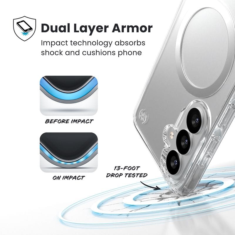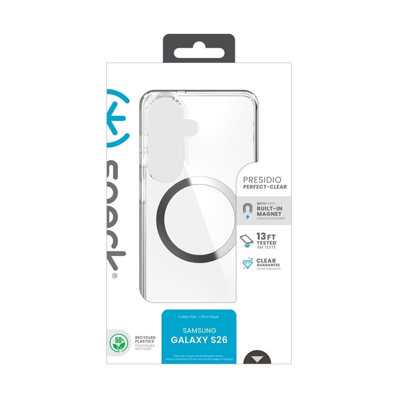 Speck Presidio® Perfect-Clear Magnet to nowoczesne, przezroczyste etui z wbudowanym pierścieniem magnetycznym, kompatybilnym z akcesoriami MagSafe®. Zaprojektowane specjalnie dla Samsung Galaxy S26, pozwala zachować oryginalny wygląd smartfona, jednocześnie oferując wysoki poziom ochrony i wygodę codziennego użytkowania.