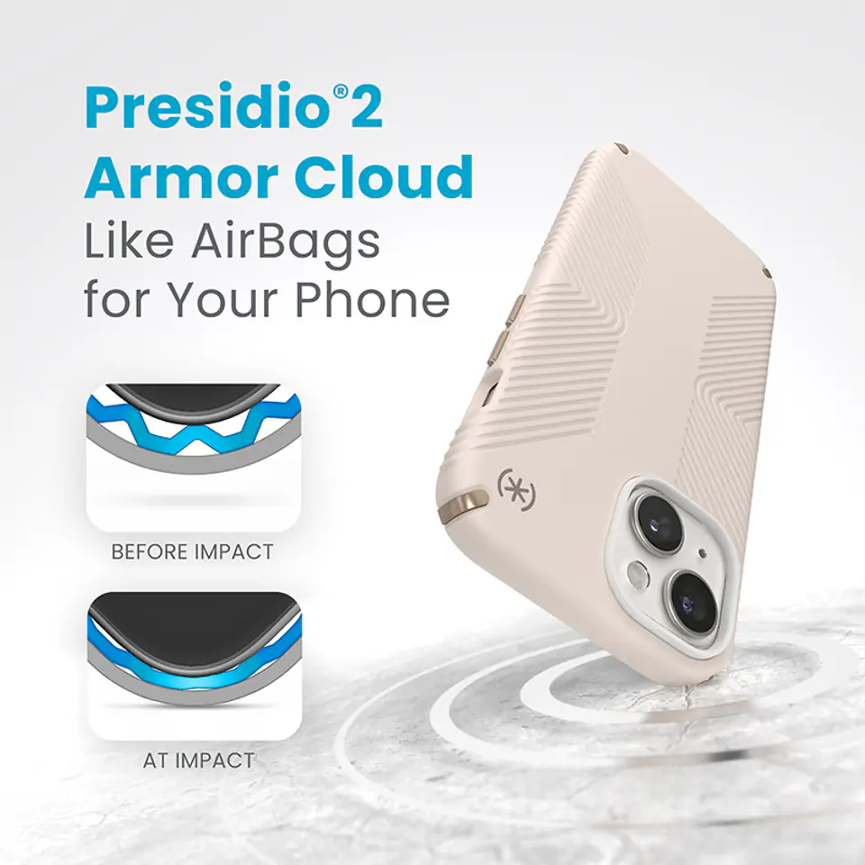 Najbardziej zaawansowany model etui zaprojektowany przez firmę Speck do iPhone’a 17e / 16e / 15 / 14 / 13. Antypoślizgowa konstrukcja z precyzyjnymi nacięciami (inverted grips) w znaczący sposób zwiększa komfort korzystania z telefonu Apple. Niezależnie od tego, czy iPhone’a używamy na dworze, podczas pracy w warsztacie lub np. na treningu, etui zapewnia pewny i wygodny chwyt.Etui Presidio2 Grip zostało ponadto wykonane w technologii Armor Cloud™, dzięki której obudowa Speck jest odporna na upadki z wysokości nawet 4 metrów. System mikrokapsułek wewnątrz ścianek etui działa na podobnej zasadzie, co poduszki powietrze stosowane w samochodach. W momencie upadku na twarde podłoże, kapsułki amortyzują siłę uderzenia przy pomocy skompresowanego w nich powietrza.Oryginalna obudowa ochronna Speck z serii Presidio2 Grip oferuje też ochronę antybakteryjną MICROBAN® (światowy lider rozwiązań przeciwdrobnoustrojowych z szerokim portfolio ponad 25 zatwierdzonych technologii). Aktywny składnik wbudowany w strukturę etui powstrzymuje 99% bakterii, które gromadzą się na powierzchni etui. Technologia MICROBAN® zapewnia w ten sposób dożywotnią ochronę przed bakteriami powodującymi plamy i nieprzyjemne zapachy oraz działa na poziomie komórkowych, aby utrzymać czystość obudowy.Etui wykonane zostało w 50% z tworzyw sztucznych pochodzących z recyklingu. Więcej informacji na stronie www.speckeco.comCechy produktu:· Antypoślizgowa konstrukcja (inverted grips)· Technologia Armor Cloud™ (kapsułki powietrzne wewnątrz etui)· Wytrzymuje upadki z wysokości nawet 4 metrów· Aktywna ochrona antybakteryjna MICROBAN®· Zwalcza 99% bakterii, które gromadzą się na powierzchni etui· Pewny i wygodny chwyt podczas pisania lub robienia zdjęć· Podwyższona ramka ekranu i aparatu· Gumowe narożniki zwiększają odporność na pęknięcia· Przyjemna w dotyku matowa powierzchnia· Wyjątkowo cienka konstrukcja hybrydowa· Wykonane w 50% z tworzyw sztucznych pochodzących z recyklingu (www.speckeco.com)· Współpracuje z ładowarkami indukcyjnymi Qi· Nie blokuje płatności zbliżeniowych Apple Pay· Kompatybilność: Apple iPhone 17e / 16e / 15 / 14 / 13