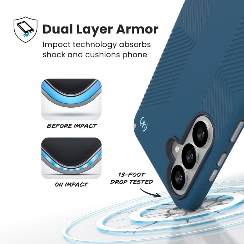 Speck Presidio®2 Grip Magnet to nowoczesne etui ochronne z wbudowanym pierścieniem magnetycznym, w pełni kompatybilnym z akcesoriami MagSafe®. Zaprojektowane dla Samsung Galaxy S26+, łączy wyjątkową odporność na upadki z ergonomiczną konstrukcją i nowoczesnym, matowym wykończeniem.
