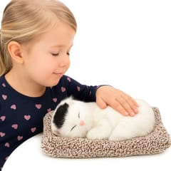 ŚPIĄCY BIAŁY KOT NA PODUSZCE – FIGURKA Z MIĘKKIM FUTERKIEM I DŹWIĘKAMI MIAUCZENIA