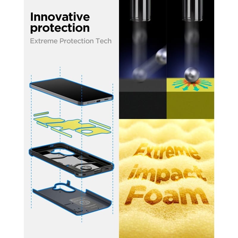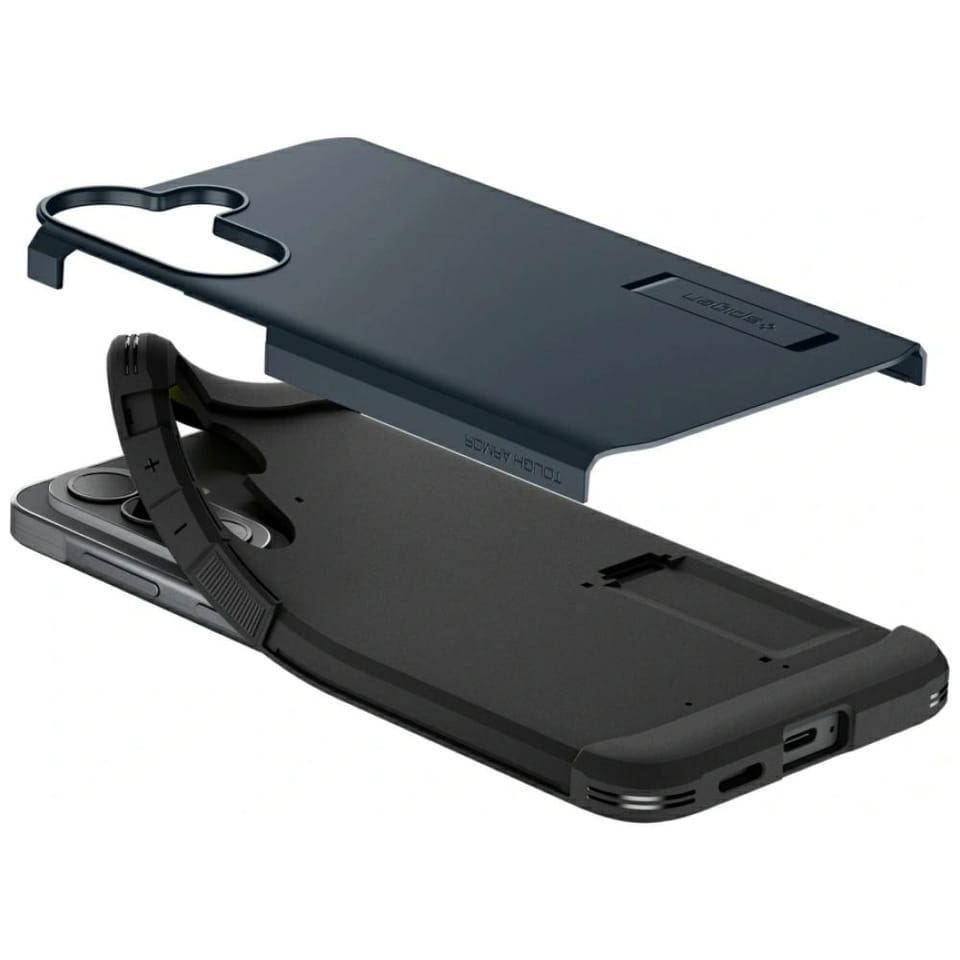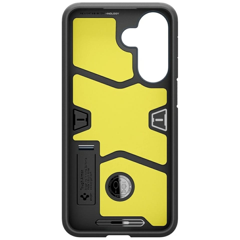 Spigen Tough Armor to hybrydowe etui, którego wewnętrzna warstwa została wykonana z trwałego i odpornego na wstrząsy elastycznego TPU, a na jego zewnętrznym panelu zastosowano twardy i wytrzymały poliwęglan. Wnętrze zostało uzupełnione cienką warstwą pianki redukującej wstrząsy. Etui jest łatwe w montażu, a jego lekko wystające krawędzie chronią kamerę i ekran przed zarysowaniami na płaskich powierzchniach.Pokrowiec został wyposażony w technologie Air Cushion (poduszki powietrzne w rogach), która amortyzują wstrząsy, chroniąc smatfona podczas upadków.Etui zostało przetestowane w ramach standardu MIL-STD-810G armii Stanów Zjednoczonych w zakresie odporności na upadki.Obudowa została wyposażona w nóżkę, umożliwiającą oglądanie tego, co aktualnie dzieje się na wyświetlaczu telefonu bez konieczności jego trzymania.Budowa zapewnia dostęp do wszystkich klawiszy funkcyjnych, gniazd i portów telefonu, nie ograniczając jego funkcjonalności.Cechy produktu:· Zintegrowane poduszki powietrzne w narożnikach· Wbudowana nóżka· Konstrukcja wykonana z TPU / PC· Ochrona przed zarysowaniem urządzenia oraz uszkodzeniem klawiszy· Dostęp do wszystkich klawiszy funkcyjnych, gniazd i portów telefonu· Łatwy w montażu i demontażu· Spełnia wojskowe standardy MIL-STD-810G