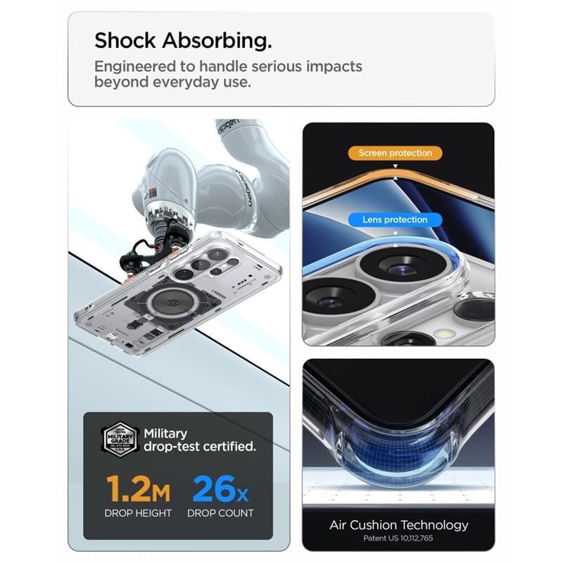 Spigen Ultra Hybrid Mag MagSafe to etui, którego ramki zostały wykonane z trwałego i odpornego na wstrząsy elastycznego TPU zwiększającego przyczepność i komfort użytkowania, a na jego tylnym panelu zastosowano wytrzymały poliwęglan. Etui jest lekkie i łatwe w montażu, a jego lekko wystające krawędzie chronią kamerę i ekran przed zarysowaniami na płaskich powierzchniach.Pokrowiec został wyposażony w technologie Air Cushion (poduszki powietrzne w rogach), która amortyzują wstrząsy, chroniąc smatfona podczas upadków.Etui zostało przetestowane w ramach standardu MIL-STD-810G armii Stanów Zjednoczonych w zakresie odporności na upadki.Budowa zapewnia dostęp do wszystkich klawiszy funkcyjnych, gniazd i portów telefonu, nie ograniczając jego funkcjonalności.Etui posiada wewnątrz magnetyczny pierścień kompatybilny z akcesoriami MagSafe gwarantując łatwe i szybkie ładowanie.Cechy produktu:· Wbudowany pierścień magnetyczny kompatybilny z ładowarką MagSafe· Zintegrowane poduszki powietrzne w narożnikach· Smukły kształt· Konstrukcja wykonana z TPU / PC· Ochrona przed zarysowaniem urządzenia oraz uszkodzeniem klawiszy· Dostęp do wszystkich klawiszy funkcyjnych, gniazd i portów telefonu· Idealnie dopasowany*UWAGA: Ładowarka MagSafe nie jest częścią zestawu