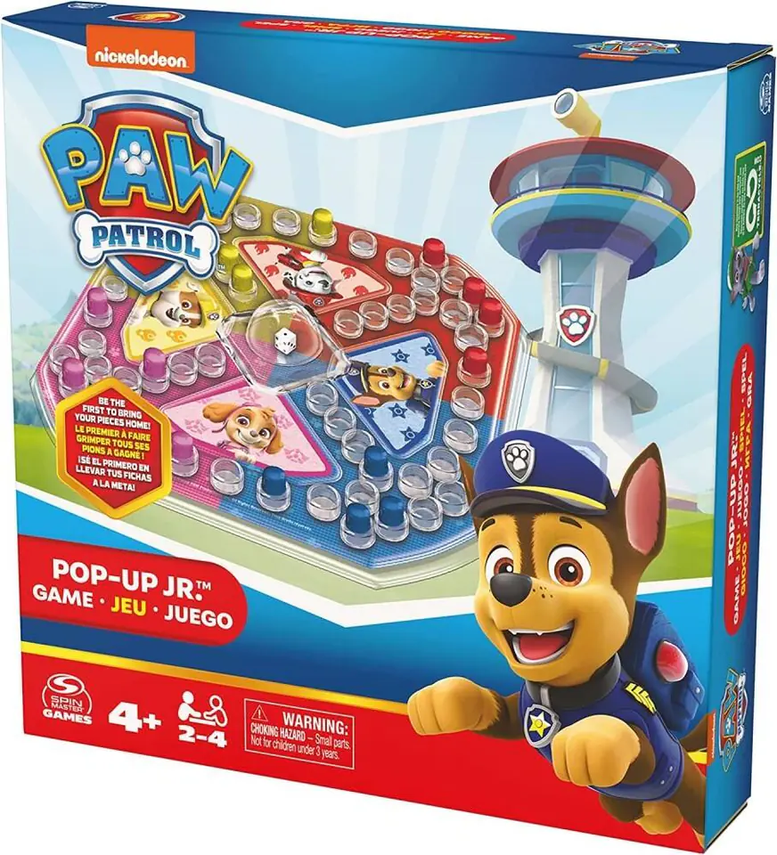 Zagraj w nową grę opartą na megapopularnym serialu Nickelodeon, Psi Patrol Pop-Up od Spin Master Games! Gra przeznaczona dla dzieci w wieku od 4 do 8 lat wyrzuć oczka, naciskając na kopułkę, i graj, by sięgnąć po zwycięstwo! Bądź pierwszym graczem, który przesunie wszystkie swoje 4 pionki prosto do mety. Jednak zachowaj ostrożność, bo ktoś może strącić Twój pionek z planszy! Prosta gra planszowa dla 2-4 graczy w wieku od 4 lat. Postaraj się, aby wszystkie Twoje pionki dotarły do mety. Pierwszy gracz, który to osiągnie, zwycięży w tej prostej grze, idealnej na rodzinne wieczorki z grami! W tej grze dla dziewczynek i chłopców występują wszystkie ulubione szczeniaki Twoich dzieci, w tym Chase, Marshall, Skye i Rubble. Jeśli Twoje dzieci wciąż nie mają dość zabawek z bajki Psi Patrol, koniecznie wypróbuj tę grę! Niezależnie od tego, czy szukasz zabawek dla 6-letniej dziewczynki, czy dla 5-letniego chłopca, ta zabawna gra Pop-Up sprawdzi się jako idealny prezent na urodziny lub święta. Ta planszowa gra dla dzieci w wieku od 4 do 6 lat przeznaczona jest dla przedszkolaków, ale ucieszy wszystkie dzieci powyżej 4 roku życia, które uwielbiają oglądać bajkę na Nickelodeon. Włącz odcinek Psiego Patrolu, wyjmij swoją grę i urządź sobie ekscytującą noc rodzinnej zabawy!