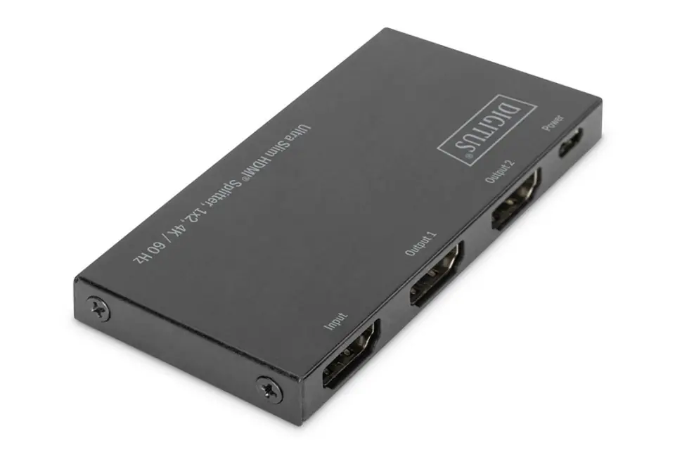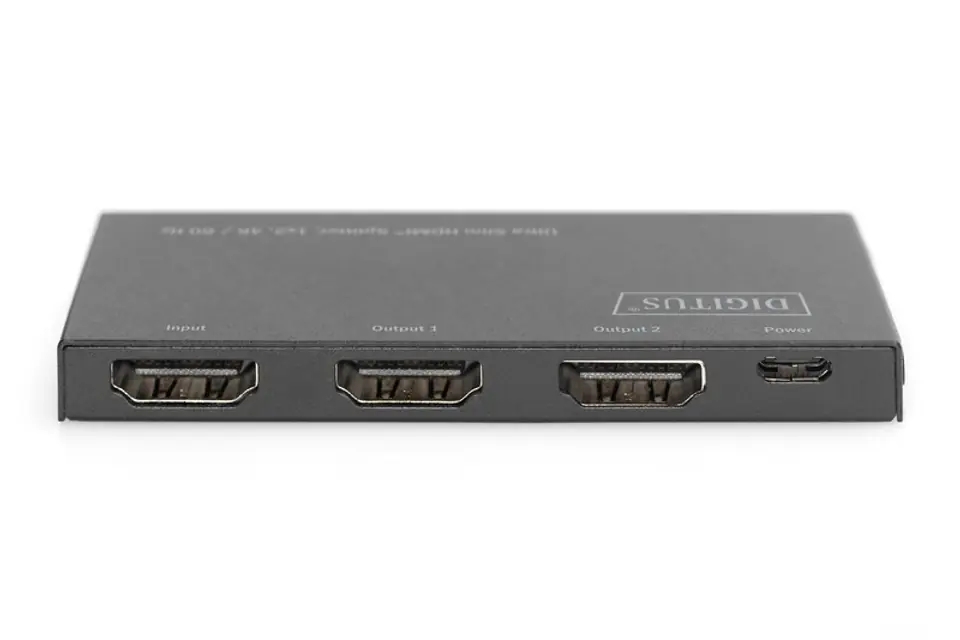 Wysokowydajny rozgałęźnik HDMI firmy DIGITUS rozprowadza sygnały audio i wideo z urządzenia HDMI na dwa ekrany, telewizory lub rzutniki w rozdzielczości UHD 4K /60 Hz. Rozgałęźnik HDMI może być zasilany przez istniejący port USB w telewizorze lub alternatywnie przez adapter ładowania USB. Istnieje możliwość kaskadowania wielu rozgałęzień aż do 8 poziomów.