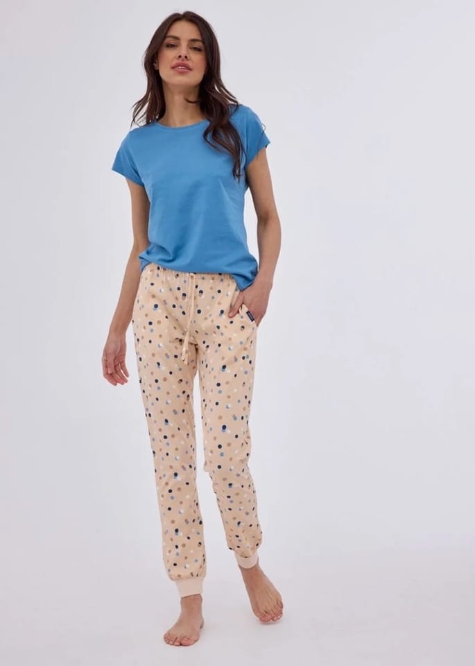 Damskie spodnie piżamowe w kolorowe groszk.W pasie szeroka, obszyta gumka i wiązanie na troczek ściągający.Praktyczne kieszenie na biodrach, nogawki zakończone ściągaczami. Skład: 100% bawełna.