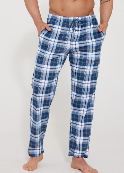 Wygodne męskie spodnie do spania z bawełny, z kieszeniami i elastycznym pasem. Wzorzysty design i komfort na co dzień. Skład:100% bawełna.