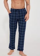 Wygodne męskie spodnie do spania z bawełny, z kieszeniami i elastycznym pasem, rozporek zapinany na guziczki. Wzorzysty design i komfort na co dzień. Skład: 100% bawełna.