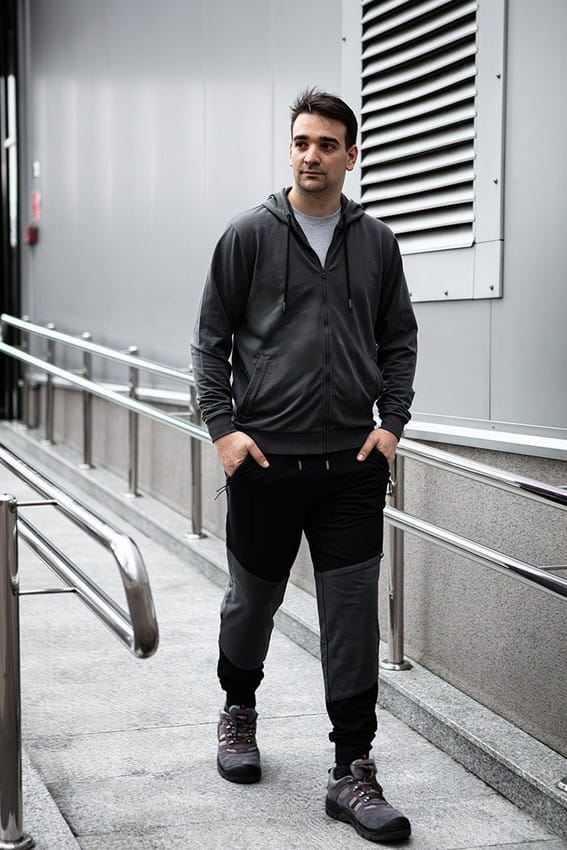 Spodnie dresowe COMFORT, czarno-szare, skład materiałowy: 57% bawełna 39% poliester 4% elastan, gramatura: 320 g/m2, guma w pasie, ściągacze w nogawkach, wzmocnienia na kolanach, wielofunkcyjne kieszenie na zamek, wewnętrzna wszywka imienna, unikalny projekt własny, certyfikat CE, rozmiar XXL