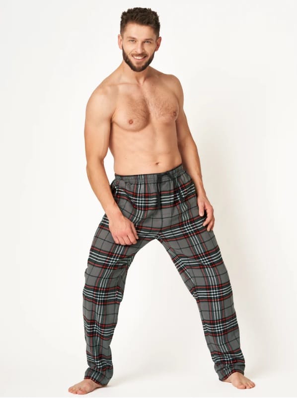 Klasyczne spodnie o prostym kroju nogawki z wygodną, miękką gumę I troczkiem w pasie. Z przodu rozporek na guziki, a po bokach głębokie kieszenie. Skład: 100% flanela bawełniana.