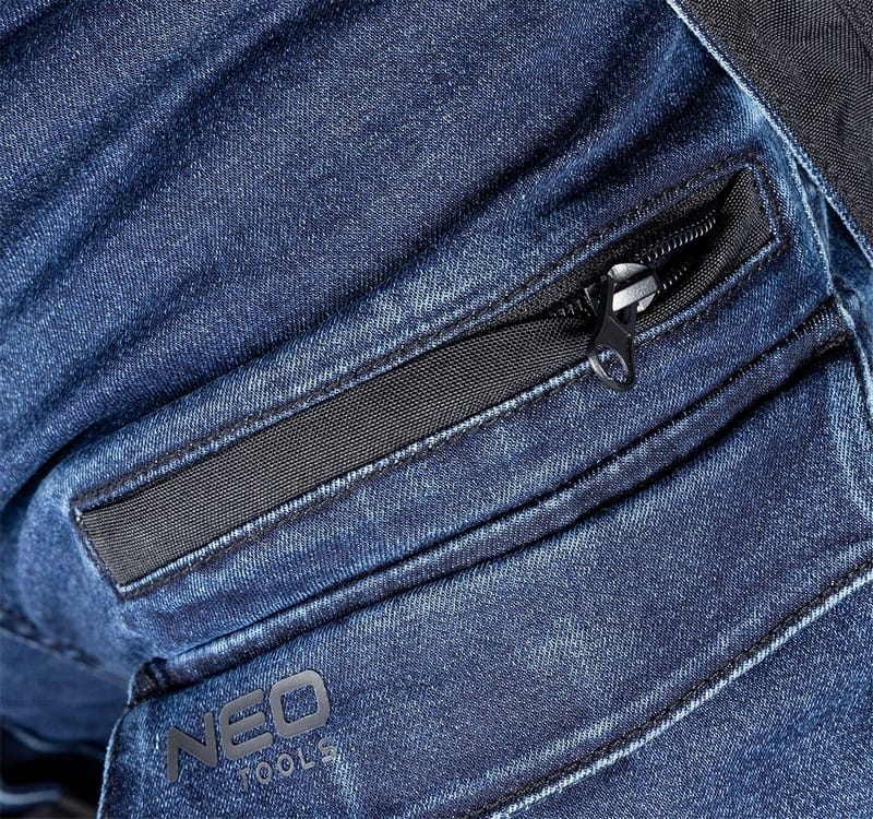 Spodnie robocze DENIM, wzmocnienia Cordura, odpinane kieszenie kaburowe, granatowe, rozmiar XS, 81-361-1-XS NEO TOOLS będące unikalnym projektem własnym marki, wykonane zostały z tkaniny jeans o składzie materiałowym 82% bawełny, 16% poliestru oraz 2% elastanu.