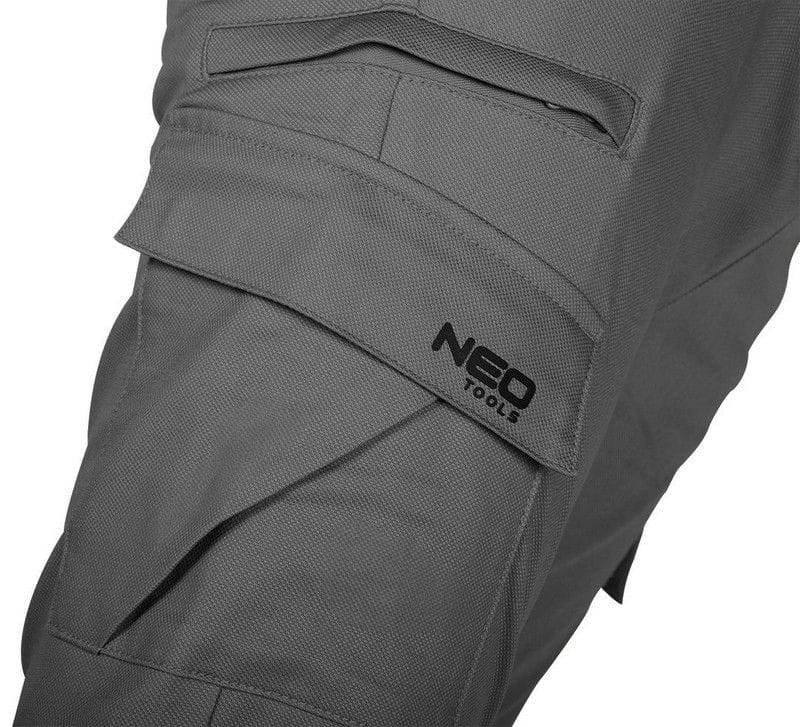 Spodnie NEO TOOLS posiadają kieszenie boczne z wypustką, dodatkowe kieszenie na udach na zamek i kieszenie przestrzenne nad kolanem.