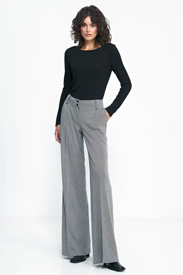 Po wielu sezonach dominacji wąskich spodni, powróciły modele z szerokimi nogawkami, tak zwane wide leg. Spodnie tego typu tworzą zgrany duet wraz z marynarka w tym samym wzorze. Posiadają lekko podwyższony stan, dzięki czemu wydłużają optycznie sylwetkę. Skład: 65% wiskoza, 30% poliester, 5% poliuretan Modelka na zdjęciu ma 176 cm wzrostu i ma sobie rozmiar 36.